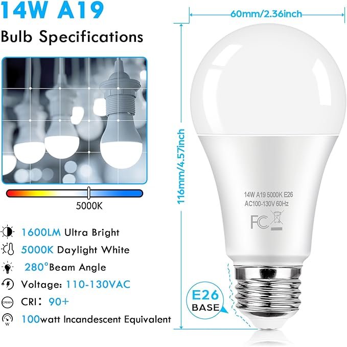 • 25000+Hrs Durable&Safe for Home-Each A19 led light bulbs tested to last 25000hrs extreme long lifetime, which serve for you over 22.83 years based on 3hrs daily usage, 20 times more compared to those whom only work for 1500hrs short-time life. Our 14W A19 light bulbs fantastically reduce the cost for extra bulb replacement. Made with premium plastic shield, these white light bulbs are shatterproof than normal glass bulb, safe for naughty kids or pets, release your worry of hurts by broken chips