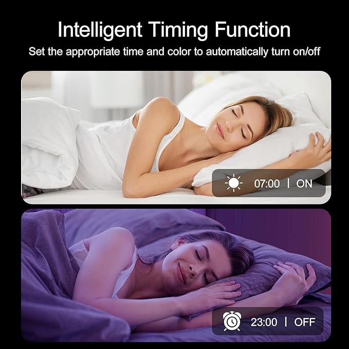 - 【Intelligent timing function】Set the LED lights to automatically turn on or off at a fixed time through an intelligent application. After the scheduled time, the LED light strip will gradually wake you up with soft light in the morning, accompanying you to sleep in the dark and giving you a sense of security